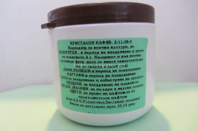 Кристалон кафяв има ниско съдържание на азот и високо съдържание на калий. Това го прави подходящ за прилагане във фаза узряване на плодовете, тъй като съдейства за натрупване на захари, ускорява узряването и подобрява оцветяването на плодовете, качеството и съхраняемостта им.